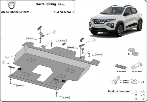 Skid plate for the protection of the: engine, gearbox, radiator The skid plate is new and fits perfectly for all versions of Dacia Spring manufactured between 2021 and 2026. Made out of 4 mm thick Aluminium plate. The shields are made of aluminum, but the mounting brackets are made of steel. Screws, nuts, clips, all fastening accessories are included. All skid plates are powder coated to prevent corrosion. The exterior of the skid plate is provided with Aluminium reinforcements, which increases the resistance to impact. |