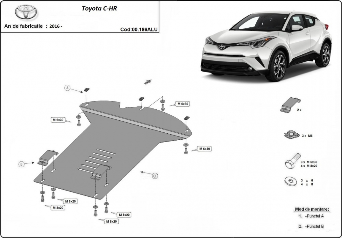 Skid plate for the protection of the: Catalytic converter The skid plate is new and fits perfectly for all versions of Toyota C-HR manufactured between 2016 and 2023. Made out of 3 mm thick Aluminium plate. The shields are made of aluminum, but the mounting brackets are made of steel. Screws, nuts, clips, all fastening accessories are included. All skid plates are powder coated to prevent corrosion. The exterior of the skid plate is provided with Aluminium reinforcements, which increases the resistance to impact. |