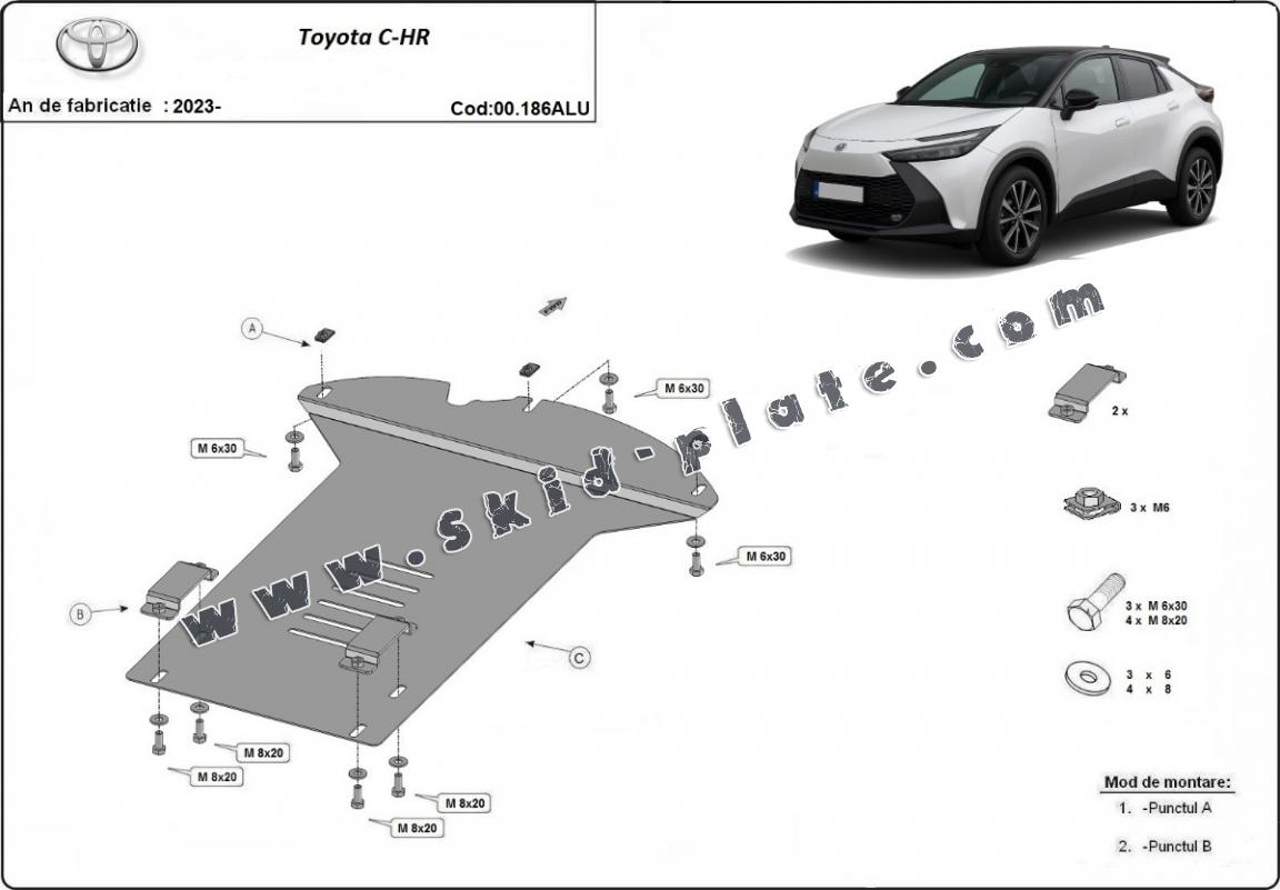 Skid plate for the protection of the: Catalytic converter The skid plate is new and fits perfectly for all versions of Toyota C-HR manufactured between 2023 and 2026. Made out of 3 mm thick Aluminium plate. The shields are made of aluminum, but the mounting brackets are made of steel. Screws, nuts, clips, all fastening accessories are included. All skid plates are powder coated to prevent corrosion. The exterior of the skid plate is provided with Aluminium reinforcements, which increases the resistance to impact. |