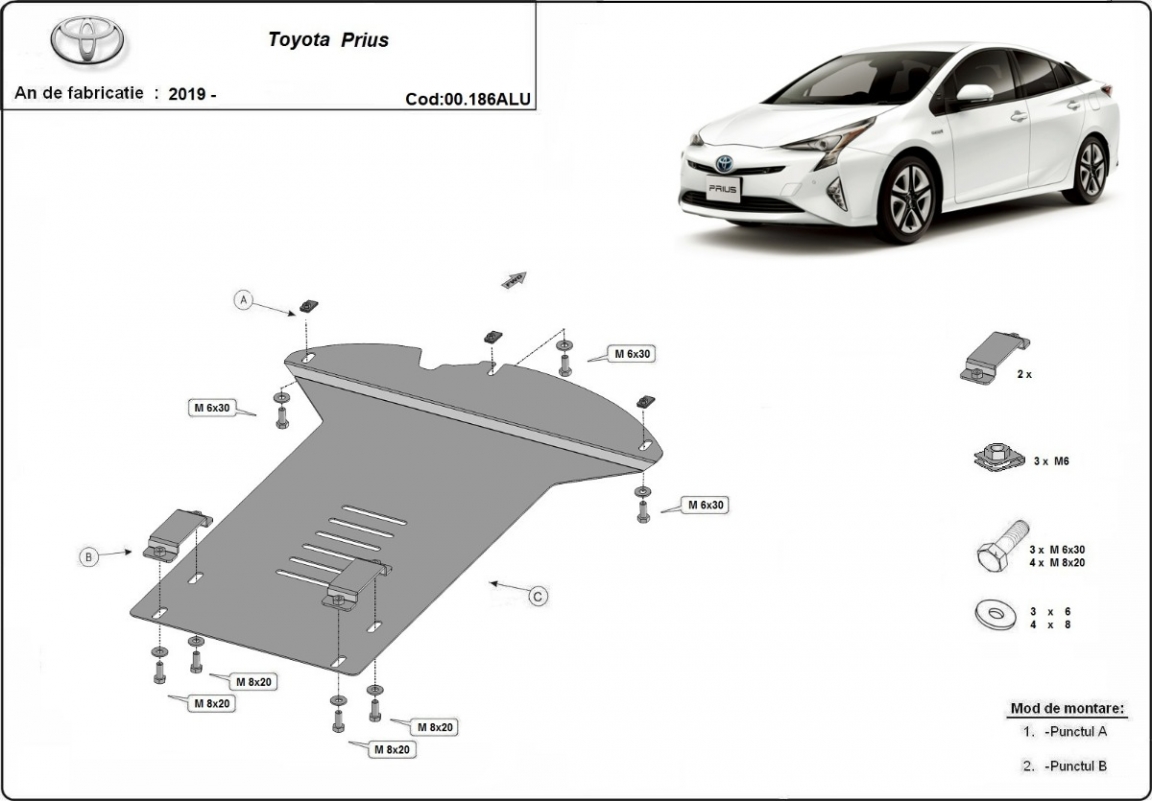 Skid plate for the protection of the: Catalytic converter The skid plate is new and fits perfectly for all versions of Toyota Prius manufactured between 2019 and 2026. Made out of 3 mm thick Aluminium plate. The shields are made of aluminum, but the mounting brackets are made of steel. Screws, nuts, clips, all fastening accessories are included. All skid plates are powder coated to prevent corrosion. The exterior of the skid plate is provided with Aluminium reinforcements, which increases the resistance to impact. |