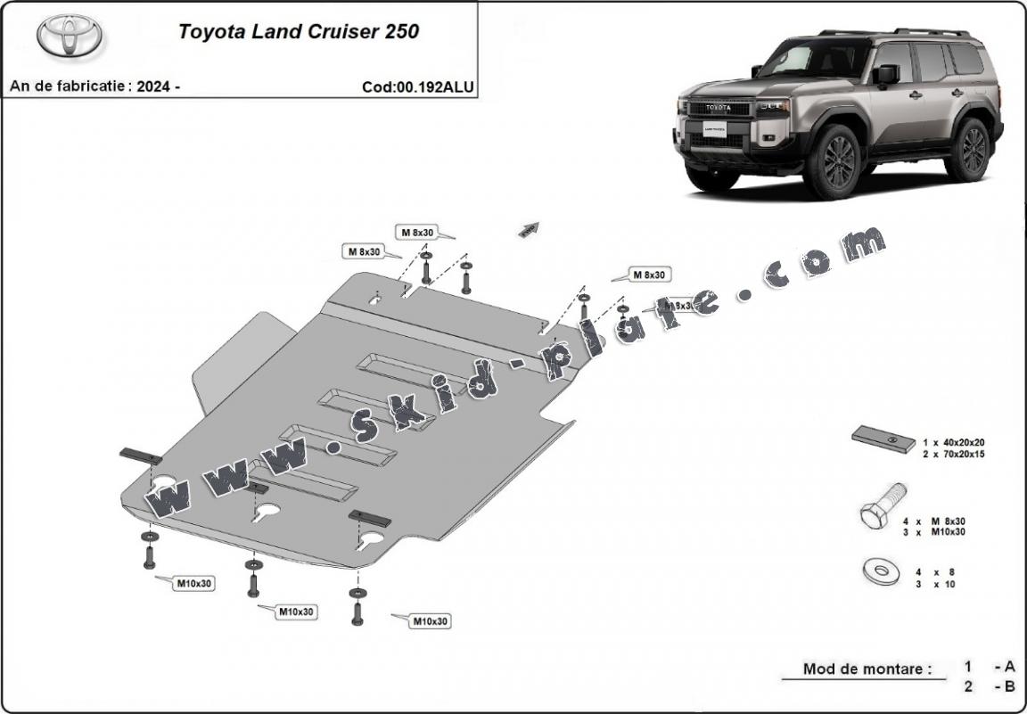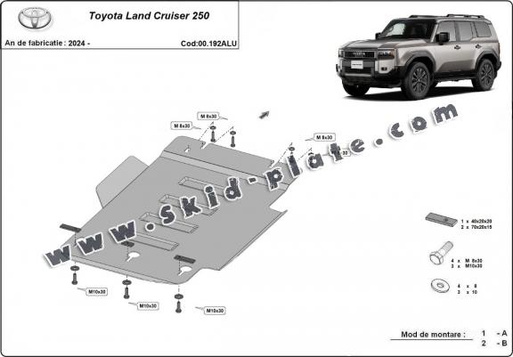 Skid plate for the protection of the: gearbox, Transfer case The skid plate is new and fits perfectly for the Toyota Land Cruiser 250, with the following engine/drive versions: Toate - manufactured between 2024 and 2026. Made out of 4 mm thick Aluminium plate. The shields are made of aluminum, but the mounting brackets are made of steel. Screws, nuts, clips, all fastening accessories are included. All skid plates are powder coated to prevent corrosion. The exterior of the skid plate is provided with Aluminium reinforcements, which increases the resistance to impact. |
