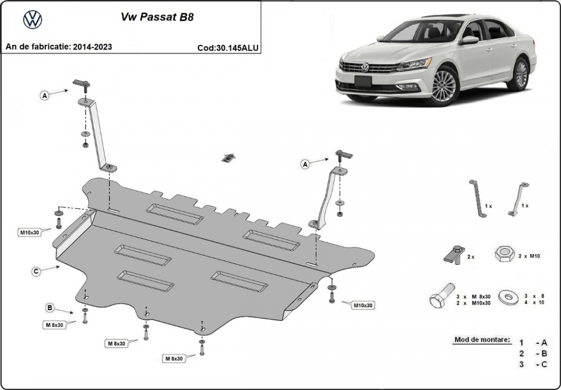 Skid plate for the protection of the: engine, gearbox, radiator, front bumper The skid plate is new and fits perfectly for all versions of VW Passat B8 manufactured between 2014 and 2023. Made out of 3 mm thick Aluminium plate. The shields are made of aluminum, but the mounting brackets are made of steel. Screws, nuts, clips, all fastening accessories are included. All skid plates are powder coated to prevent corrosion. The exterior of the skid plate is provided with Aluminium reinforcements, which increases the resistance to impact. |