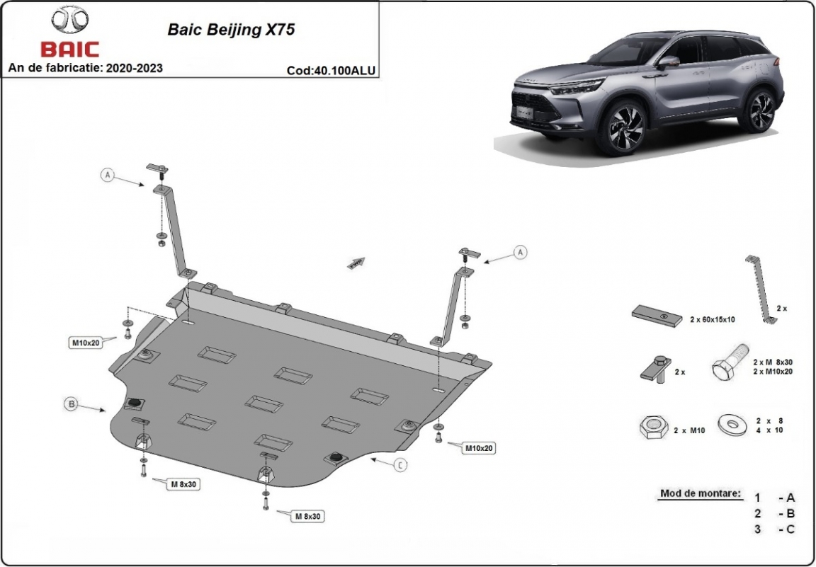 Skid plate for the protection of the: engine, gearbox, radiator The skid plate is new and fits perfectly for all versions of BAIC Beijing X75 manufactured between 2020 and 2023. Made out of 3 mm thick Aluminium plate. The shields are made of aluminum, but the mounting brackets are made of steel. Screws, nuts, clips, all fastening accessories are included. All skid plates are powder coated to prevent corrosion. The exterior of the skid plate is provided with Aluminium reinforcements, which increases the resistance to impact. |
