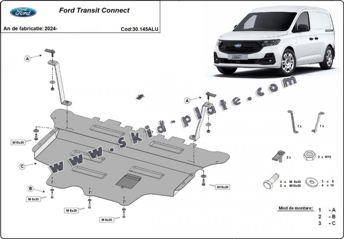 Skid plate for the protection of the: engine, gearbox, radiator, front bumper The skid plate is new and fits perfectly for all versions of Ford Transit Connect manufactured between 2024 and 2026. Made out of 3 mm thick Aluminium plate. The shields are made of aluminum, but the mounting brackets are made of steel. Screws, nuts, clips, all fastening accessories are included. All skid plates are powder coated to prevent corrosion. The exterior of the skid plate is provided with Aluminium reinforcements, which increases the resistance to impact. |