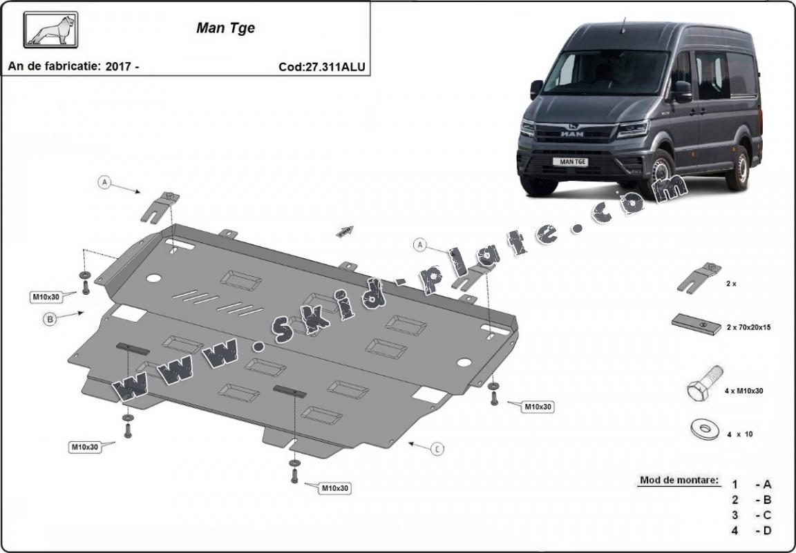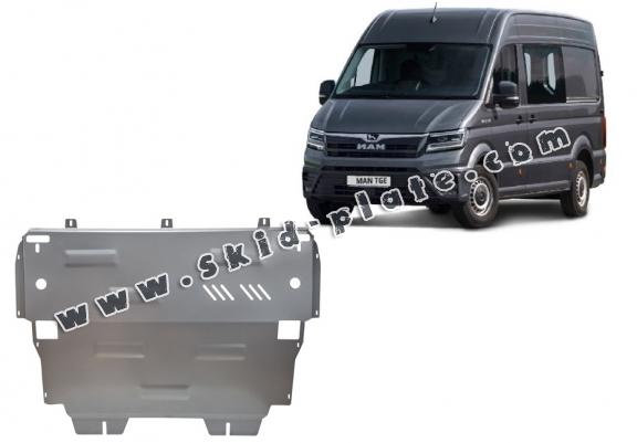 Skid plate for the protection of the: engine, gearbox, radiator The skid plate is new and fits perfectly for all versions of MAN Tge manufactured between 2017 and 2026. Made out of 3 mm thick Aluminium plate. The shields are made of aluminum, but the mounting brackets are made of steel. Screws, nuts, clips, all fastening accessories are included. All skid plates are powder coated to prevent corrosion. The exterior of the skid plate is provided with Aluminium reinforcements, which increases the resistance to impact. |