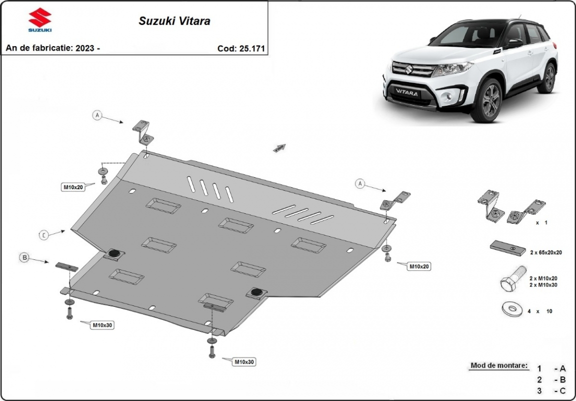 Skid plate for the protection of the: engine, gearbox The skid plate is new and fits perfectly for the Suzuki Vitara, with the following engine/drive versions: Hybrid - manufactured between 2023 and 2026. Made out of 4 mm thick Aluminium plate. The shields are made of aluminum, but the mounting brackets are made of steel. Screws, nuts, clips, all fastening accessories are included. All skid plates are powder coated to prevent corrosion. The exterior of the skid plate is provided with Aluminium reinforcements, which increases the resistance to impact. |