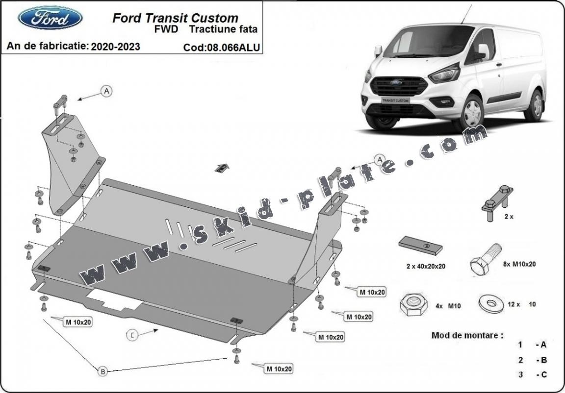Aluminum skid plate for the protection of the engine and the gearbox for Ford Transit Custom - FWD (2020-2023)