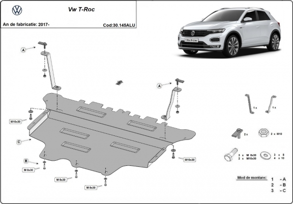 Skid plate for the protection of the: engine, gearbox, radiator, front bumper The skid plate is new and fits perfectly for all versions of Volkswagen T-Roc manufactured between 2017 and 2026. Made out of 3 mm thick Aluminium plate. The shields are made of aluminum, but the mounting brackets are made of steel. Screws, nuts, clips, all fastening accessories are included. All skid plates are powder coated to prevent corrosion. The exterior of the skid plate is provided with Aluminium reinforcements, which increases the resistance to impact. |