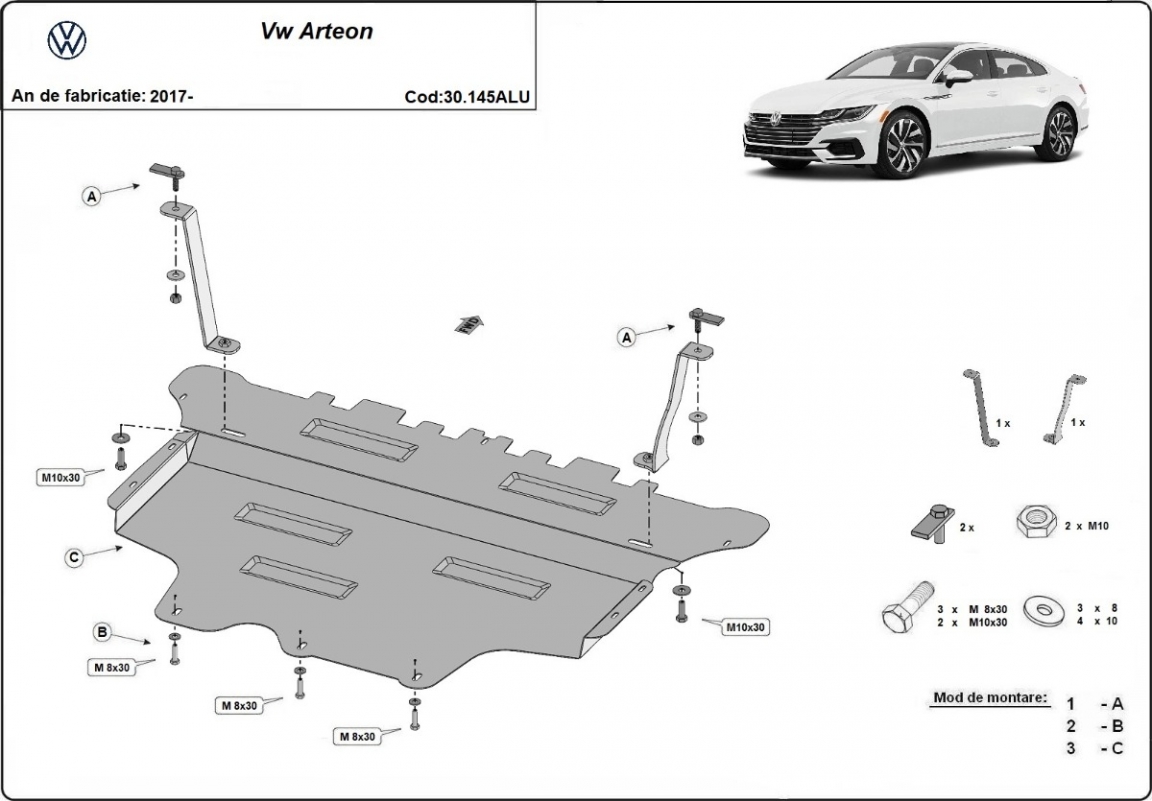 Skid plate for the protection of the: engine, gearbox, radiator, front bumper The skid plate is new and fits perfectly for all versions of VW Arteon manufactured between 2017 and 2026. Made out of 3 mm thick Aluminium plate. The shields are made of aluminum, but the mounting brackets are made of steel. Screws, nuts, clips, all fastening accessories are included. All skid plates are powder coated to prevent corrosion. The exterior of the skid plate is provided with Aluminium reinforcements, which increases the resistance to impact. |