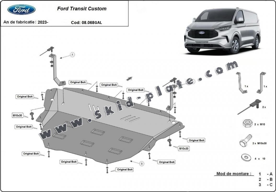 Skid plate for the protection of the: engine, gearbox, radiator The skid plate is new and fits perfectly for all versions of Ford Transit Custom manufactured between 2023 and 2026. Made out of 2 mm thick Steel plate. Screws, nuts, clips, all fastening accessories are included. All skid plates are powder coated to prevent corrosion. The exterior of the skid plate is provided with Steel reinforcements, which increases the resistance to impact. |