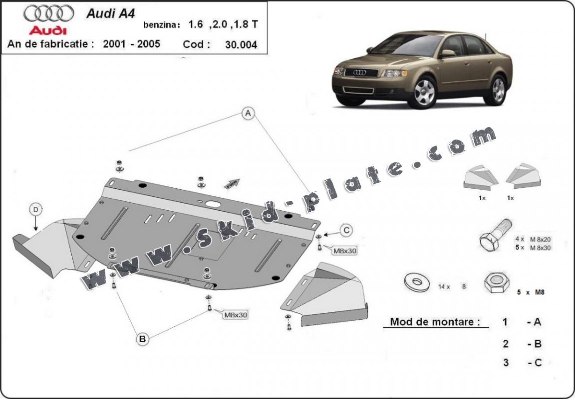 The skid plate is new and fits perfectly for the Audi A4 B6, with the following engine/drive versions: 1.6 - 2.0 , 1.8T - manufactured between 2000 and 2005.