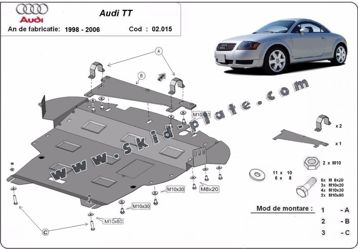 Skid plate for the protection of the: engine, gearbox, radiator, front bumper The skid plate is new and fits perfectly for all versions of Audi TT manufactured between 1998 and 2006. It has an opening for the oil sump, so it's removal won't be necessary to change the oil. Made out of 2 mm thick Steel plate. Screws, nuts, clips, all fastening accessories are included. All skid plates are powder coated to prevent corrosion. The exterior of the skid plate is provided with Steel reinforcements, which increases the resistance to impact. |