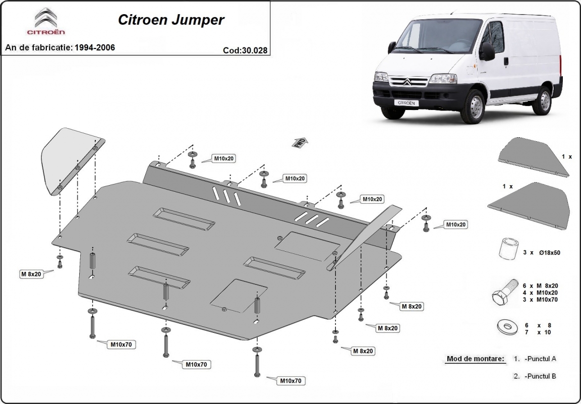 Skid plate for the protection of the: engine, gearbox, radiator The skid plate is new and fits perfectly for all versions of Citroen Jumper manufactured between 1995 and 2006. It has an opening for the oil sump, so it's removal won't be necessary to change the oil. Made out of 2 mm thick Steel plate. Screws, nuts, clips, all fastening accessories are included. All skid plates are powder coated to prevent corrosion. The exterior of the skid plate is provided with Steel reinforcements, which increases the resistance to impact. |