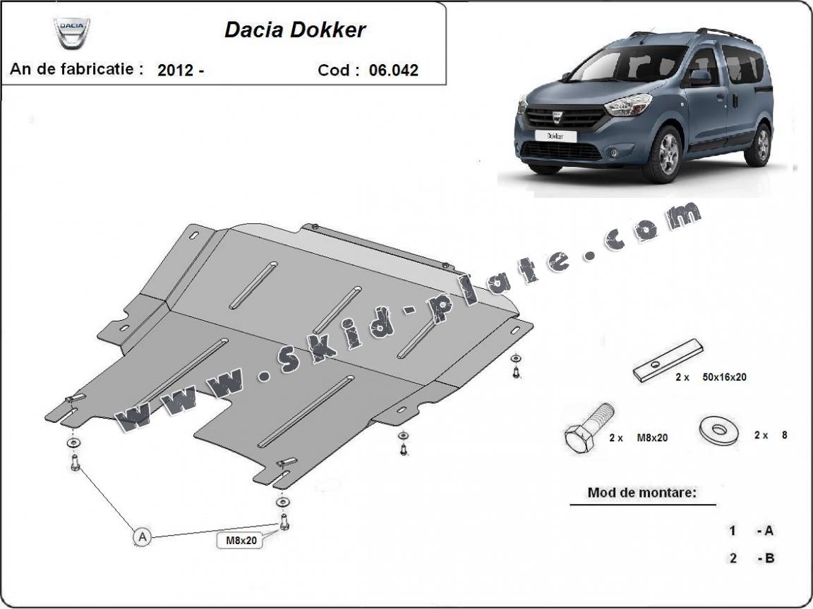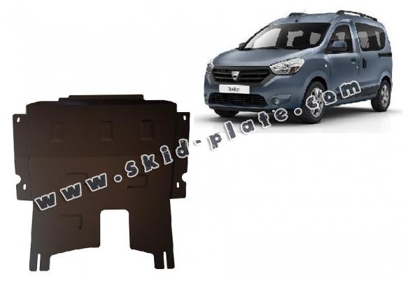 Skid plate for the protection of the: engine, gearbox The skid plate is new and fits perfectly for all versions of Dacia Dokker manufactured between 2012 and 2026. Made out of 2 mm thick Steel plate. Screws, nuts, clips, all fastening accessories are included. All skid plates are powder coated to prevent corrosion. The exterior of the skid plate is provided with Steel reinforcements, which increases the resistance to impact. |