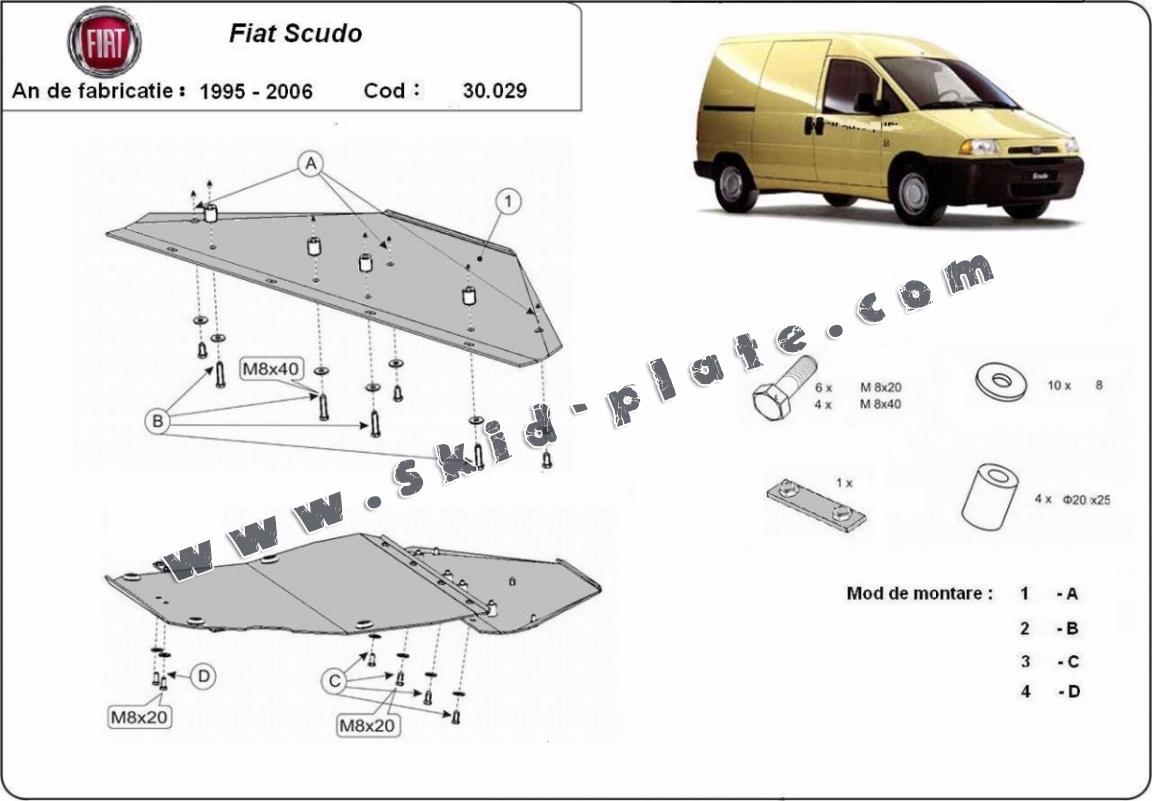 Skid plate for the protection of the: engine, gearbox, radiator, front bumper The skid plate is new and fits perfectly for all versions of Fiat Scudo manufactured between 1995 and 2006. Made out of 2 mm thick Steel plate. Screws, nuts, clips, all fastening accessories are included. All skid plates are powder coated to prevent corrosion. The exterior of the skid plate is provided with Steel reinforcements, which increases the resistance to impact. |
