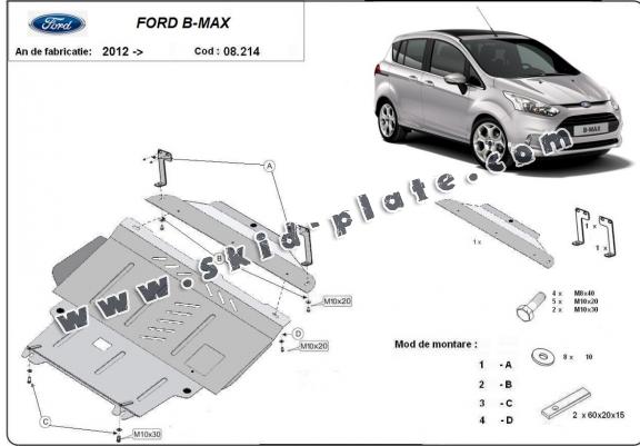 Skid plate for the protection of the: engine, gearbox, front bumper The skid plate is new and fits perfectly for all versions of Ford B-Max manufactured between 2012 and 2017. It has an opening for the oil sump, so it's removal won't be necessary to change the oil. Made out of 2 mm thick Steel plate. Screws, nuts, clips, all fastening accessories are included. All skid plates are powder coated to prevent corrosion. The exterior of the skid plate is provided with Steel reinforcements, which increases the resistance to impact. |