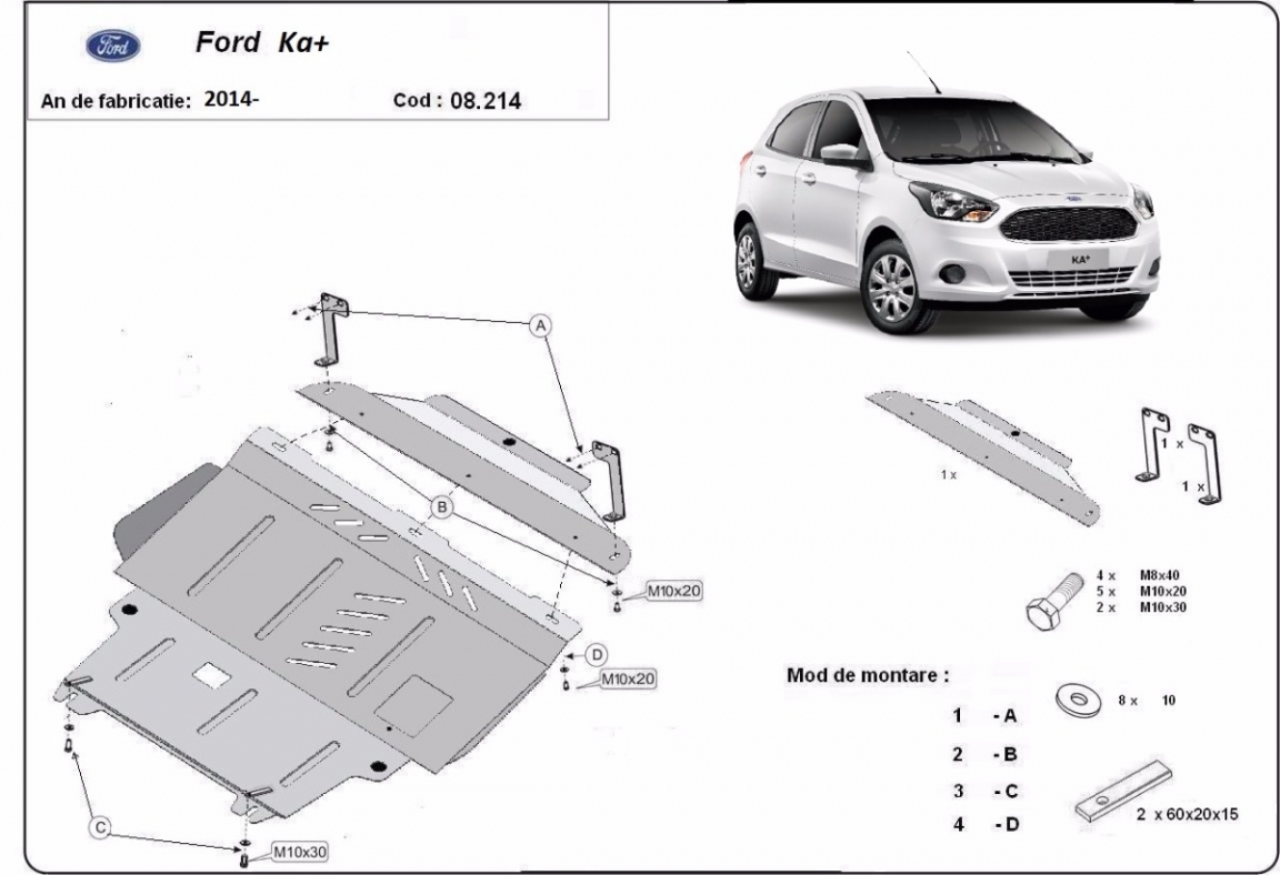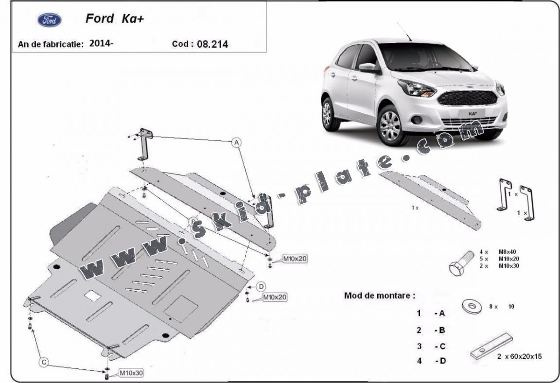 Skid plate for the protection of the: engine, gearbox, radiator, front bumper The skid plate is new and fits perfectly for all versions of Ford KA manufactured between 2014 and 2020. It has an opening for the oil sump, so it's removal won't be necessary to change the oil. Made out of 2 mm thick Steel plate. Screws, nuts, clips, all fastening accessories are included. All skid plates are powder coated to prevent corrosion. The exterior of the skid plate is provided with Steel reinforcements, which increases the resistance to impact. |