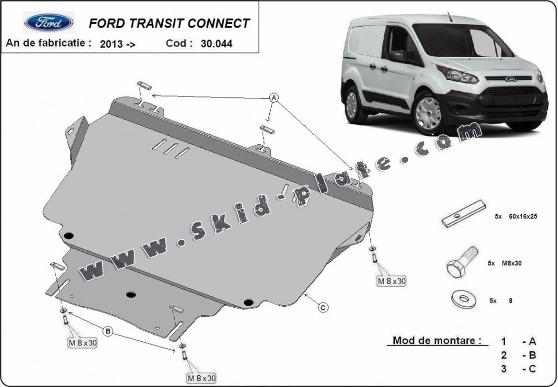 Skid plate for the protection of the: engine, gearbox, radiator The skid plate is new and fits perfectly for all versions of Ford Transit Connect manufactured between 2013 and 2021. Made out of 2 mm thick Steel plate. Screws, nuts, clips, all fastening accessories are included. All skid plates are powder coated to prevent corrosion. The exterior of the skid plate is provided with Steel reinforcements, which increases the resistance to impact. |