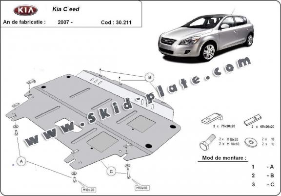 Skid plate for the protection of the: engine, gearbox The skid plate is new and fits perfectly for all versions of Kia Ceed manufactured between 2007 and 2011. It has an opening for the oil sump, so it's removal won't be necessary to change the oil. Made out of 2 mm thick Steel plate. Screws, nuts, clips, all fastening accessories are included. All skid plates are powder coated to prevent corrosion. The exterior of the skid plate is provided with Steel reinforcements, which increases the resistance to impact. |