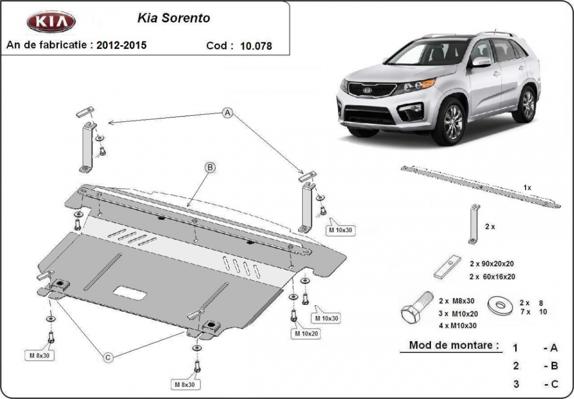 Skid plate for the protection of the: engine, gearbox The skid plate is new and fits perfectly for all versions of Kia Sorento manufactured between 2012 and 2014. Made out of 2 mm thick Steel plate. Screws, nuts, clips, all fastening accessories are included. All skid plates are powder coated to prevent corrosion. The exterior of the skid plate is provided with Steel reinforcements, which increases the resistance to impact. |