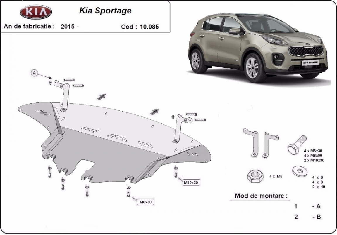 Skid plate for the protection of the: engine, gearbox, radiator, front bumper The skid plate is new and fits perfectly for all versions of Kia Sportage manufactured between 2015 and 2019. Made out of 2 mm thick Steel plate. Screws, nuts, clips, all fastening accessories are included. All skid plates are powder coated to prevent corrosion. The exterior of the skid plate is provided with Steel reinforcements, which increases the resistance to impact. |