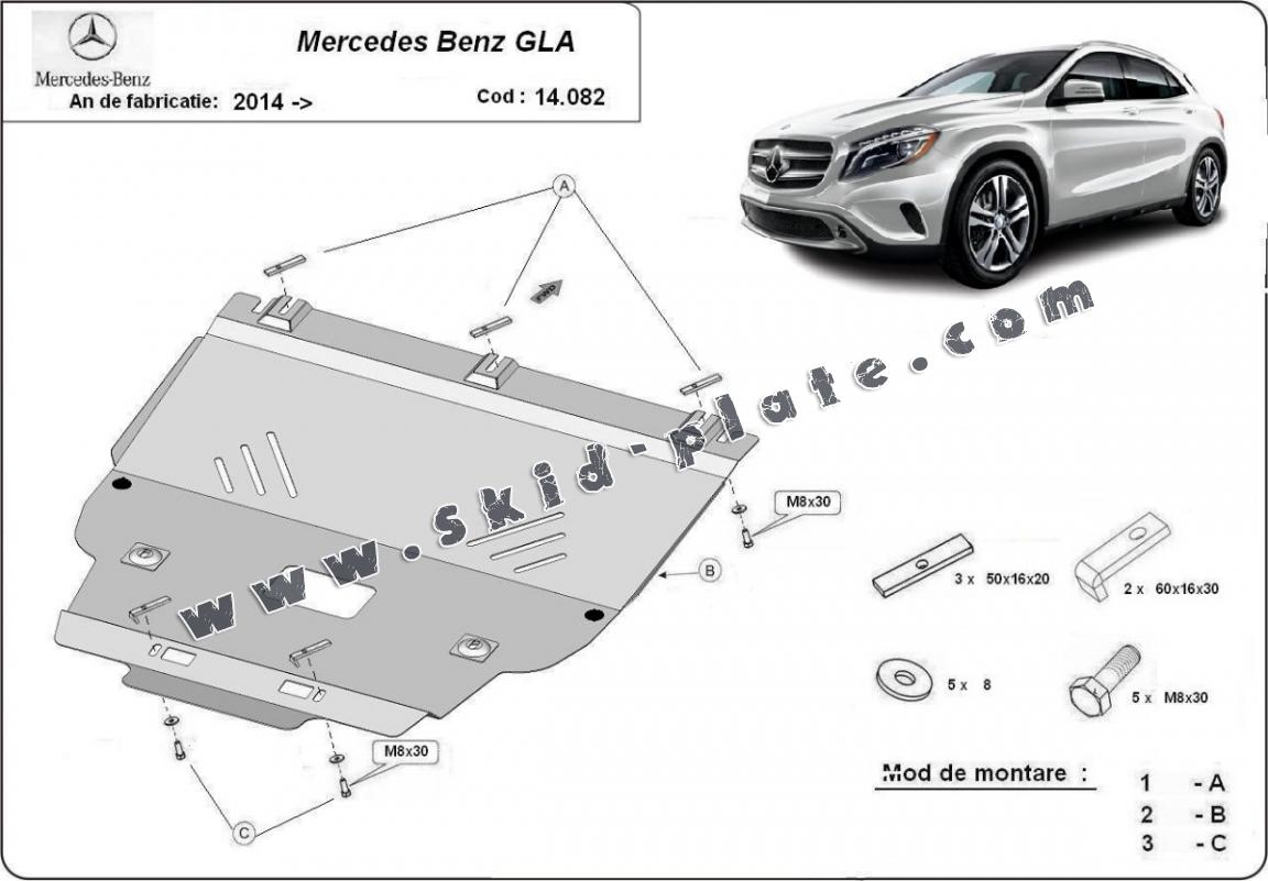 | The skid plate is new and fits perfectly for the Mercedes GLA X156, with the following engine/drive versions: 14.082 - manufactured between 2014 and 2020. |
