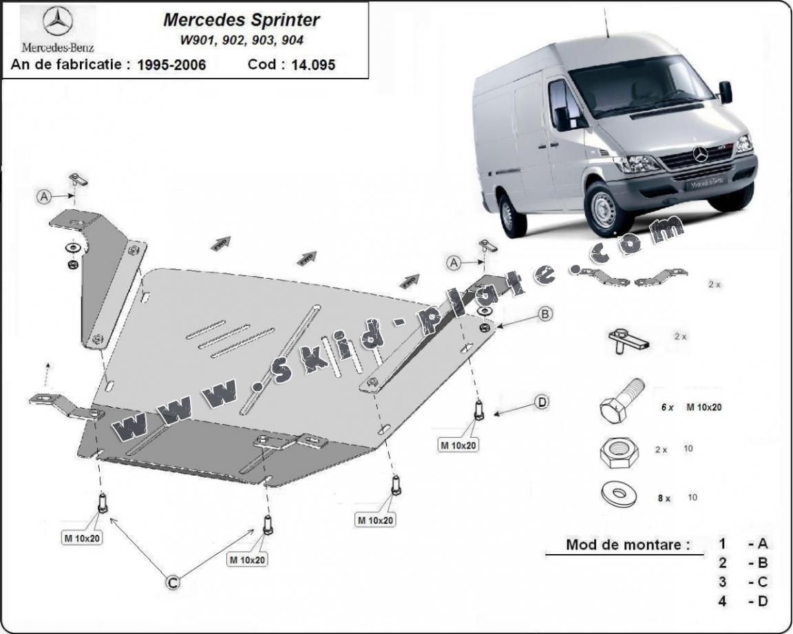 The skid plate is new and fits perfectly for all versions of Mercedes Sprinter manufactured between 1995 and 2006.