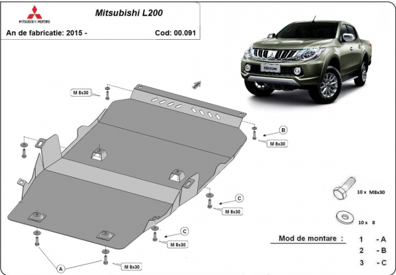 Skid plate for the protection of the: engine, gearbox, transfer case The skid plate is new and fits perfectly for all versions of Mitsubishi L200 manufactured between 2015 and 2026. Made out of 2.5 mm thick Steel plate. Screws, nuts, clips, all fastening accessories are included. All skid plates are powder coated to prevent corrosion. The exterior of the skid plate is provided with Steel reinforcements, which increases the resistance to impact. |