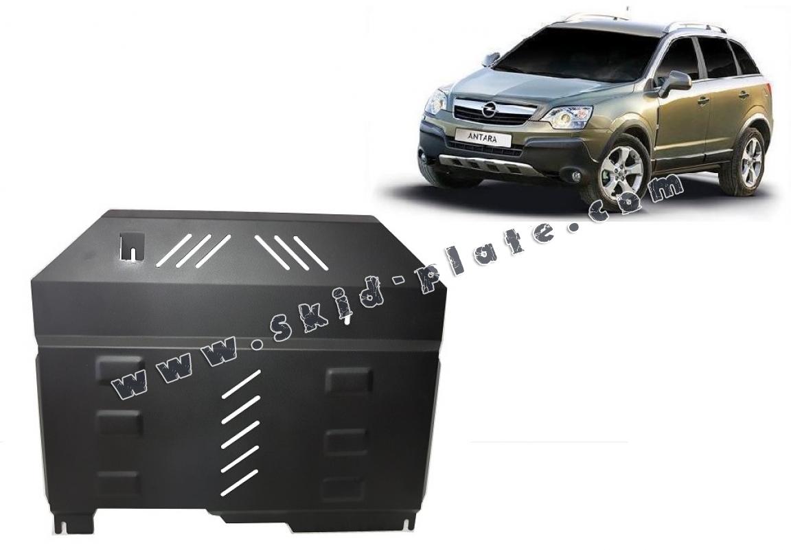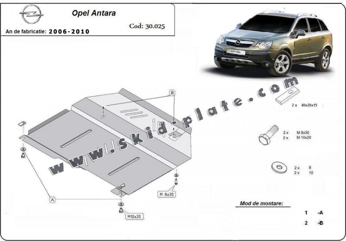 Skid plate for the protection of the: engine, gearbox, radiator The skid plate is new and fits perfectly for the Opel Antara, with the following engine/drive versions: 2.0 , 2.4 , 3.2 - manufactured between 2006 and 2010. Made out of 2.5 mm thick Steel plate. Screws, nuts, clips, all fastening accessories are included. All skid plates are powder coated to prevent corrosion. The exterior of the skid plate is provided with Steel reinforcements, which increases the resistance to impact. |