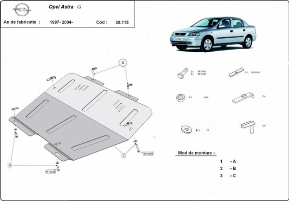 Skid plate for the protection of the: engine, gearbox, radiator The skid plate is new and fits perfectly for the Opel Astra G, with the following engine/drive versions: 1.4-2.0 - manufactured between 1997 and 2004. Made out of 2 mm thick Steel plate. Screws, nuts, clips, all fastening accessories are included. All skid plates are powder coated to prevent corrosion. The exterior of the skid plate is provided with Steel reinforcements, which increases the resistance to impact. |