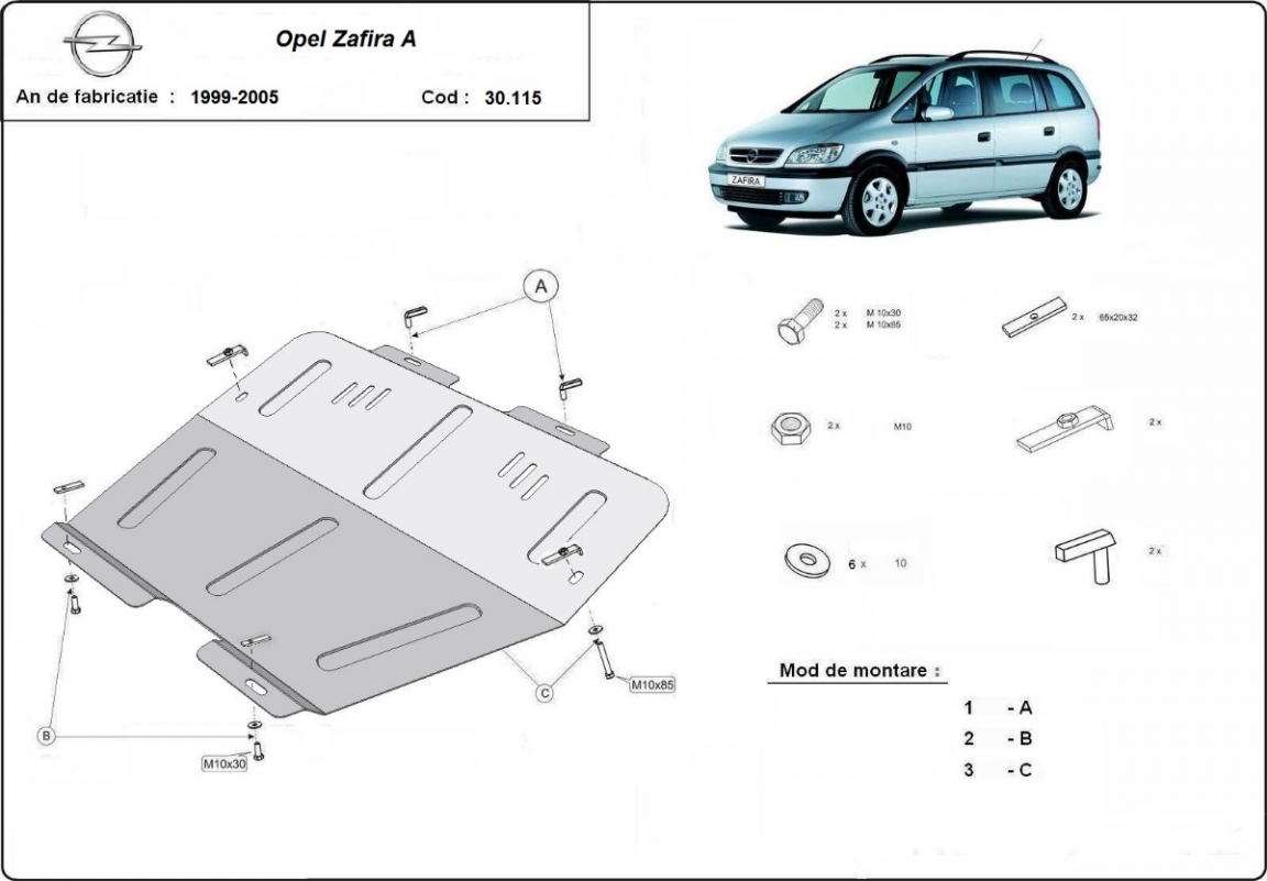 Skid plate for the protection of the: engine, gearbox, radiator The skid plate is new and fits perfectly for all versions of Opel Zafira manufactured between 1999 and 2005. Made out of 2 mm thick Steel plate. Screws, nuts, clips, all fastening accessories are included. All skid plates are powder coated to prevent corrosion. The exterior of the skid plate is provided with Steel reinforcements, which increases the resistance to impact. |