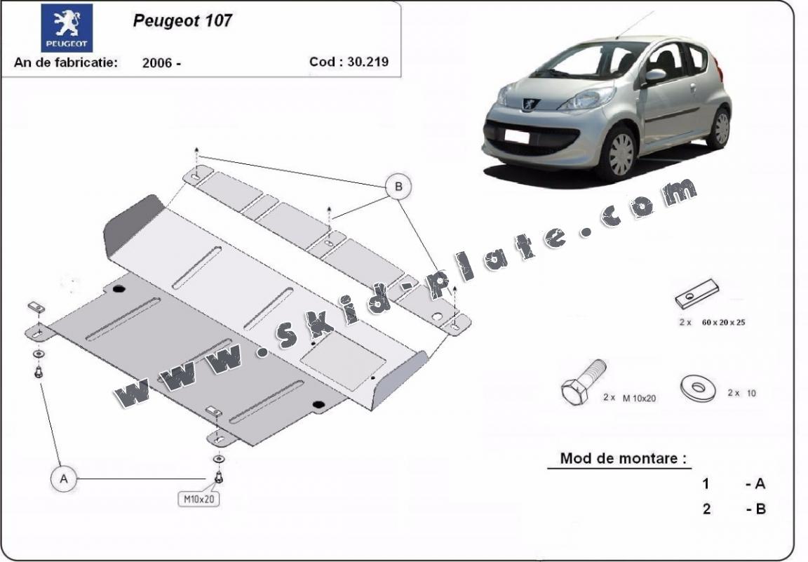 Skid plate for the protection of the: engine, gearbox, radiator The skid plate is new and fits perfectly for all versions of Peugeot 107 manufactured between 2006 and 2014. It has an opening for the oil sump, so it's removal won't be necessary to change the oil. Made out of 2 mm thick Steel plate. Screws, nuts, clips, all fastening accessories are included. All skid plates are powder coated to prevent corrosion. The exterior of the skid plate is provided with Steel reinforcements, which increases the resistance to impact. |