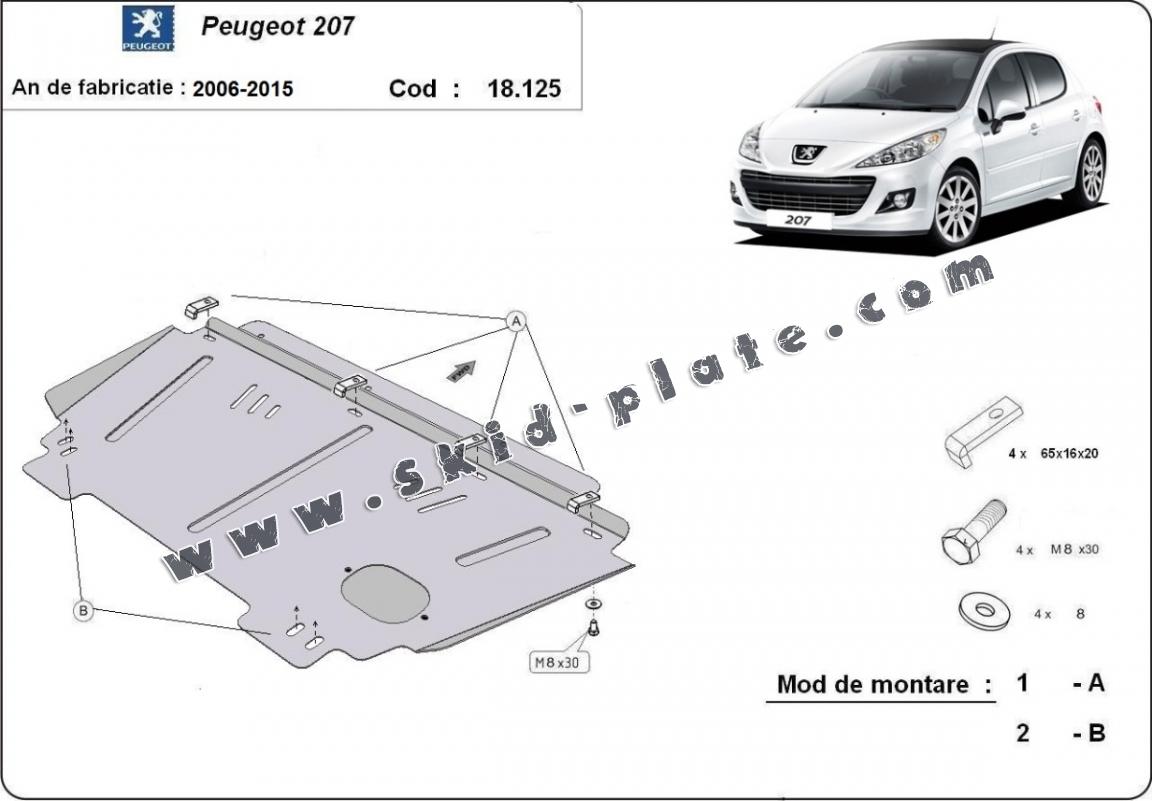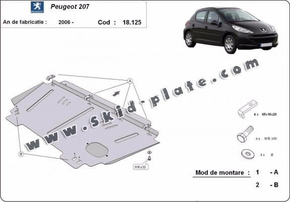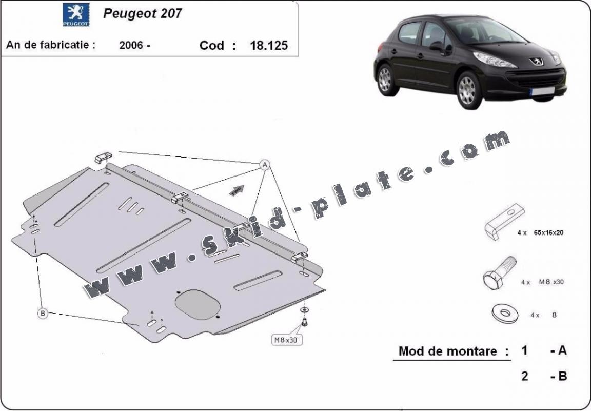 Skid plate for the protection of the: engine, gearbox, radiator The skid plate is new and fits perfectly for all versions of Peugeot 207 manufactured between 2006 and 2014. It has an opening for the oil sump, so it's removal won't be necessary to change the oil. Made out of 2 mm thick Steel plate. Screws, nuts, clips, all fastening accessories are included. All skid plates are powder coated to prevent corrosion. The exterior of the skid plate is provided with Steel reinforcements, which increases the resistance to impact. |