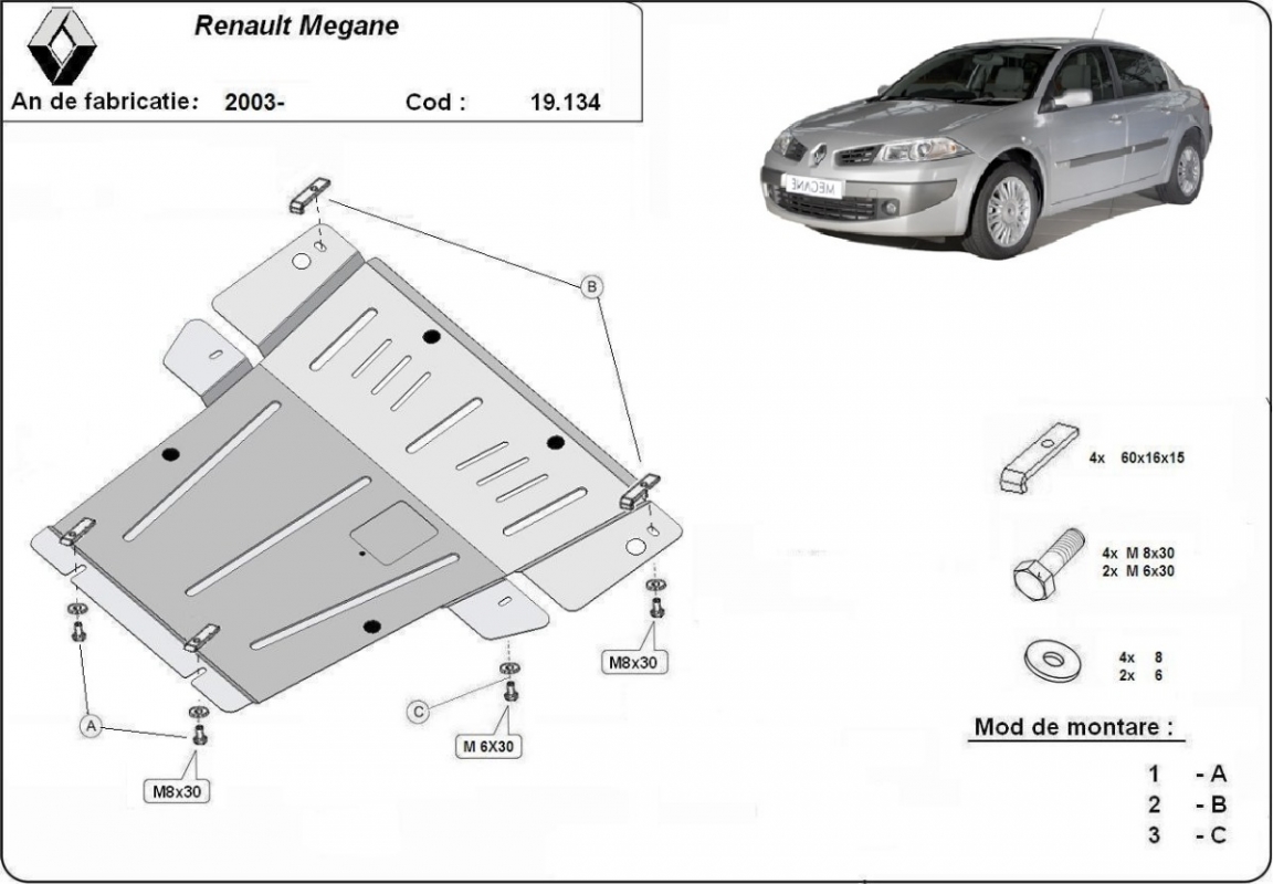 The skid plate is new and fits perfectly for all versions of Renault Megane 2 manufactured between 2004 and 2008.
