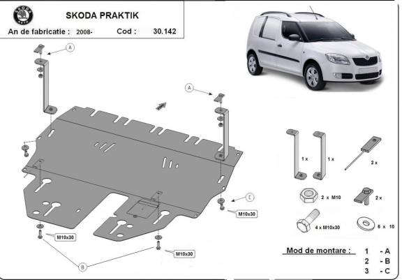 Skid plate for the protection of the: engine, gearbox, radiator, front bumper The skid plate is new and fits perfectly for all versions of Skoda Praktik manufactured between 2006 and 2015. It has an opening for the oil sump, so it's removal won't be necessary to change the oil. Made out of 2 mm thick Steel plate. Screws, nuts, clips, all fastening accessories are included. All skid plates are powder coated to prevent corrosion. The exterior of the skid plate is provided with Steel reinforcements, which increases the resistance to impact. |