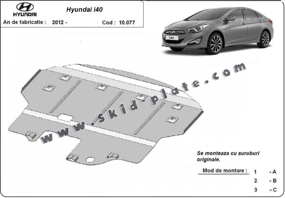 | The skid plate is new and fits perfectly for all versions of Hyundai i40 manufactured between 2012 and 2015. |