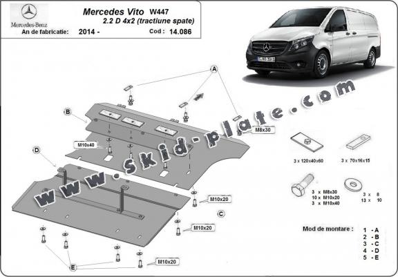 | The skid plate is new and fits perfectly for the Mercedes Vito W447 - 2.2D 4X2 , with the following engine/drive versions: 2.2D, 4X2 RWD - manufactured between 2014 and 2020. |