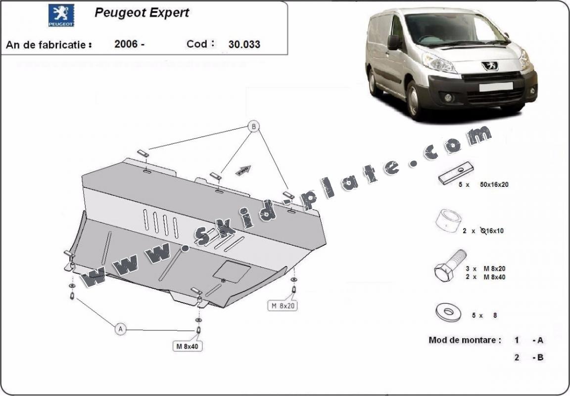 Skid plate for the protection of the: engine, gearbox, radiator The skid plate is new and fits perfectly for all versions of Peugeot Expert manufactured between 2006 and 2016. It has an opening for the oil sump, so it's removal won't be necessary to change the oil. Made out of 2 mm thick Steel plate. Screws, nuts, clips, all fastening accessories are included. All skid plates are powder coated to prevent corrosion. The exterior of the skid plate is provided with Steel reinforcements, which increases the resistance to impact. |
