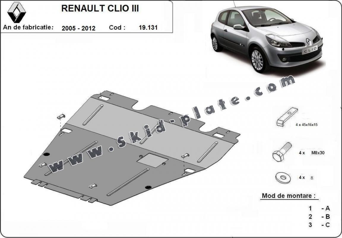 | The skid plate is new and fits perfectly for all versions of Renault Clio 3 manufactured between 2005 and 2012. |