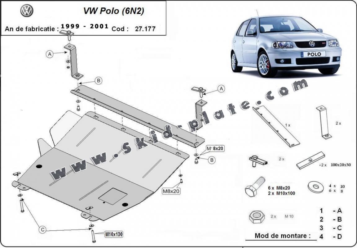 The skid plate is new and fits perfectly for the VW Polo 6n2, with the following engine/drive versions: 1.0, 1.2, 1.4, 1.6 - manufactured between 1999 and 2001.