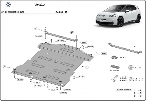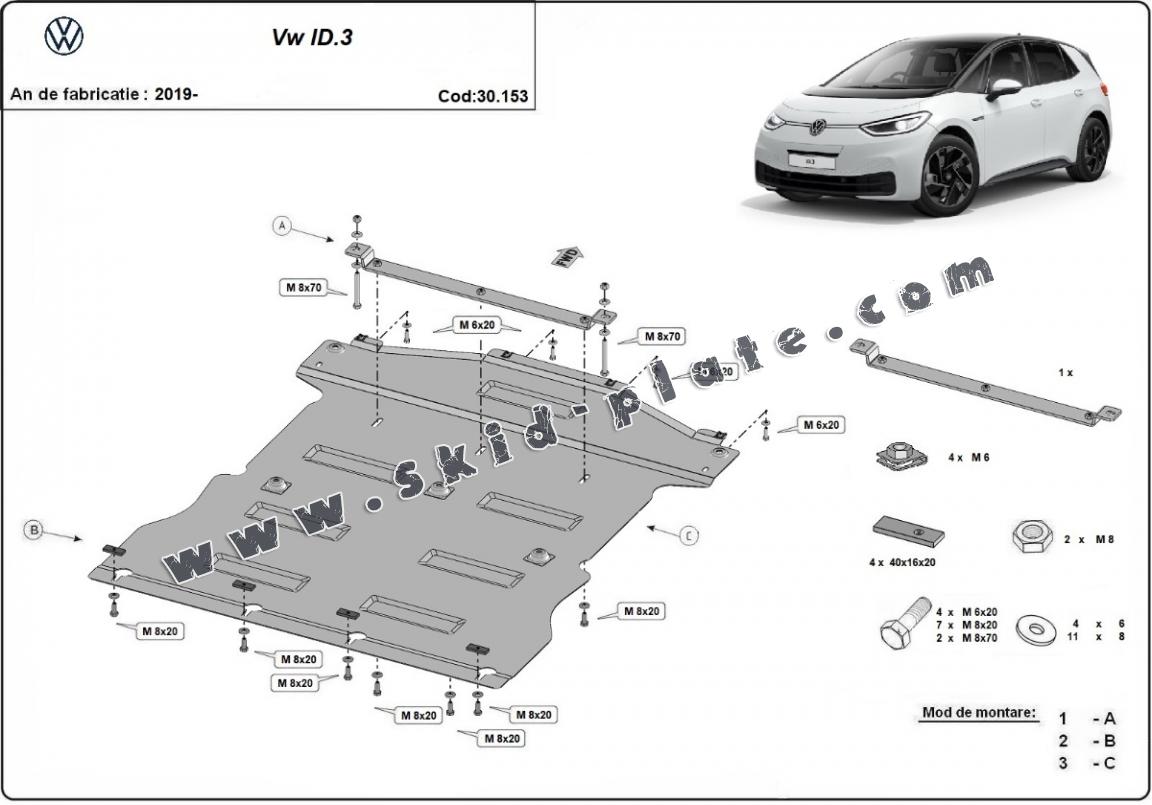 Skid plate for the protection of the: engine, gearbox, radiator The skid plate is new and fits perfectly for all versions of Volkswagen ID 3 manufactured between 2019 and 2026. Made out of 2 mm thick Steel plate. Screws, nuts, clips, all fastening accessories are included. All skid plates are powder coated to prevent corrosion. The exterior of the skid plate is provided with Steel reinforcements, which increases the resistance to impact. |