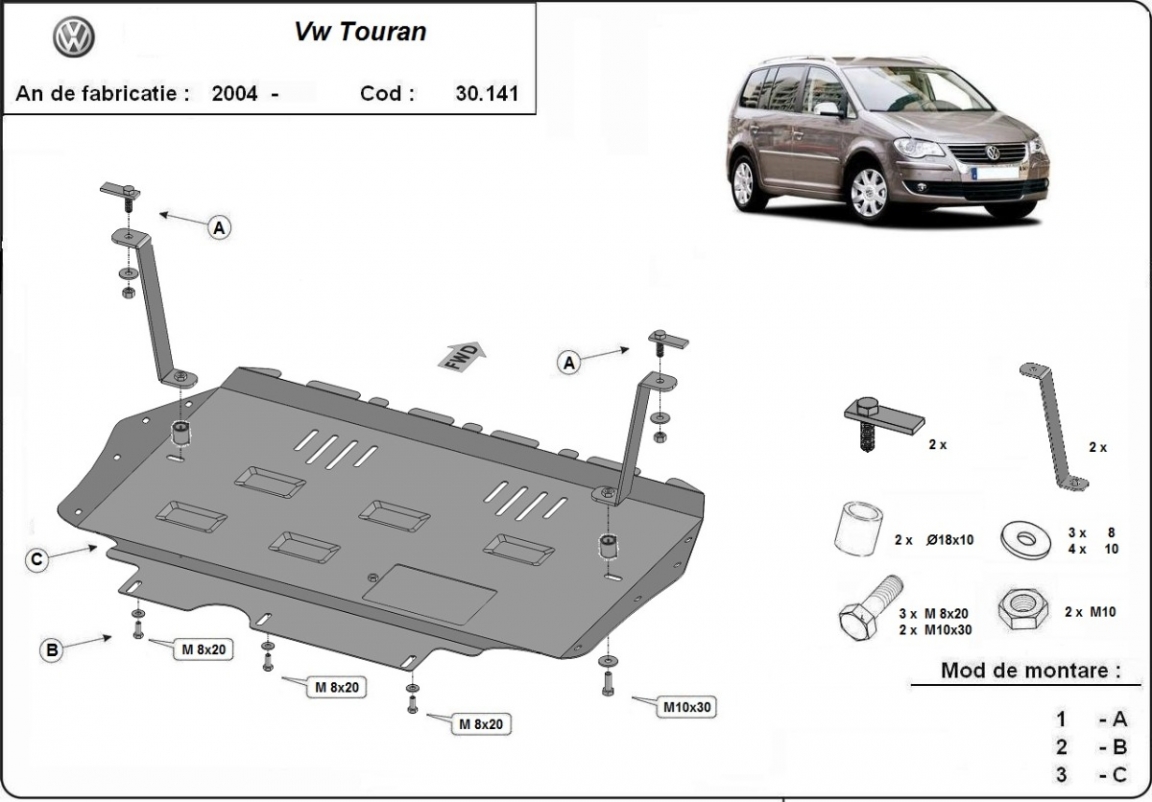 Skid plate for the protection of the: engine, gearbox, radiator The skid plate is new and fits perfectly for all versions of Volkswagen Touran manufactured between 2003 and 2015. It has an opening for the oil sump, so it's removal won't be necessary to change the oil. Made out of 2 mm thick Steel plate. Screws, nuts, clips, all fastening accessories are included. All skid plates are powder coated to prevent corrosion. The exterior of the skid plate is provided with Steel reinforcements, which increases the resistance to impact. |
