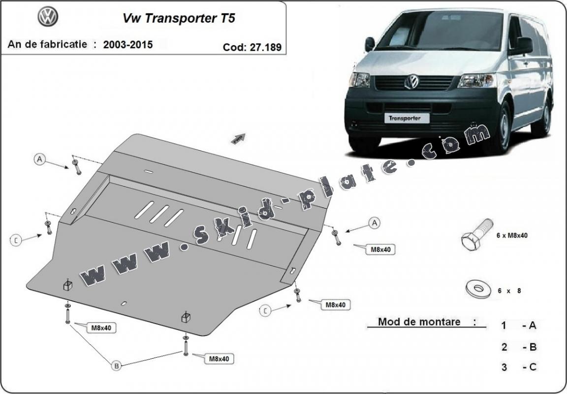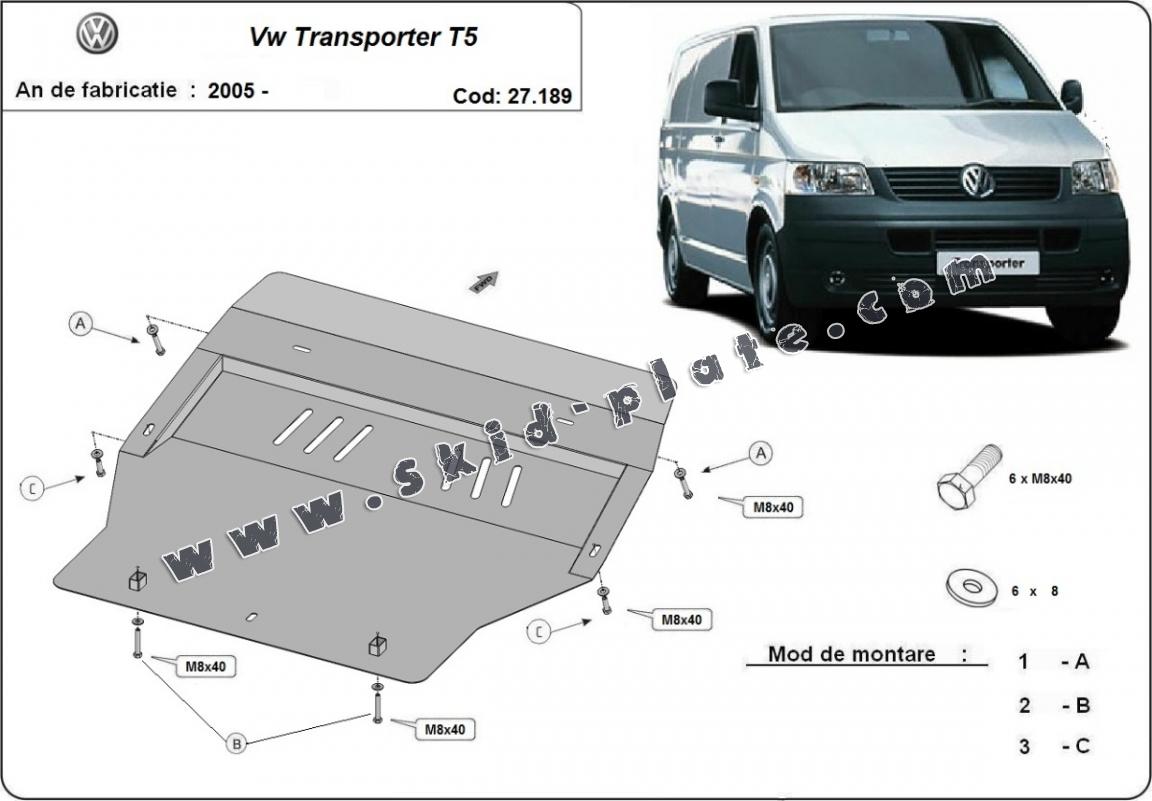 The skid plate is new and fits perfectly for all versions of Volkswagen Transporter T5 manufactured between 2004 and 2015.