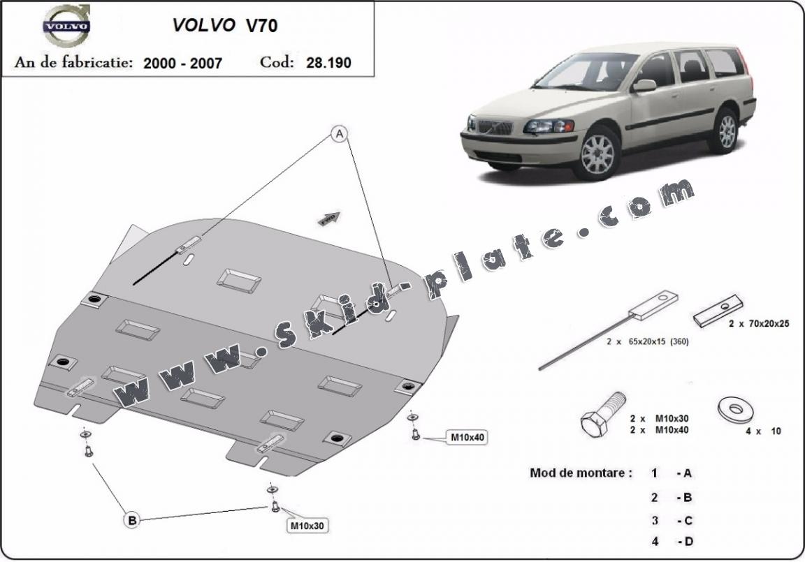 Skid plate for the protection of the: engine, gearbox, radiator The skid plate is new and fits perfectly for all versions of Volvo V70 manufactured between 2000 and 2006. Made out of 2 mm thick Steel plate. Screws, nuts, clips, all fastening accessories are included. All skid plates are powder coated to prevent corrosion. The exterior of the skid plate is provided with Steel reinforcements, which increases the resistance to impact. |