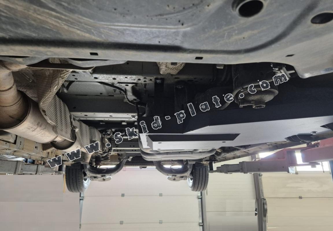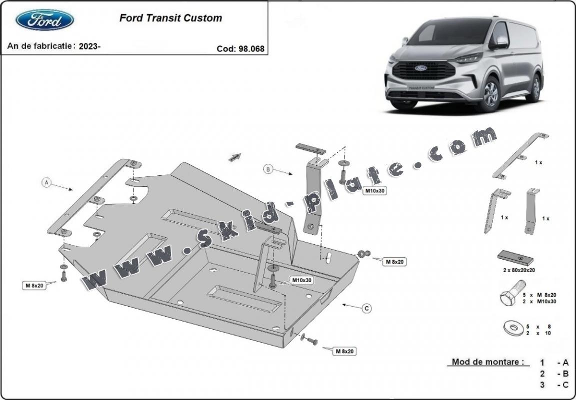 Skid plate for the protection of the: fuel tank AdBlue The skid plate is new and fits perfectly for all versions of Ford Transit Custom manufactured between 2023 and 2026. Made out of 2 mm thick Steel plate. Screws, nuts, clips, all fastening accessories are included. All skid plates are powder coated to prevent corrosion. The exterior of the skid plate is provided with Steel reinforcements, which increases the resistance to impact. |