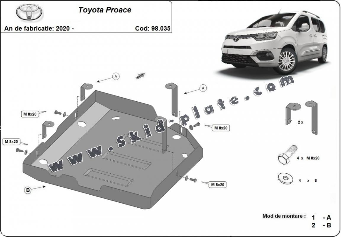 Skid plate for the protection of the: fuel tank AdBlue The skid plate is new and fits perfectly for all versions of Toyota Proace manufactured between 2020 and 2026. Made out of 2 mm thick Steel plate. Screws, nuts, clips, all fastening accessories are included. All skid plates are powder coated to prevent corrosion. The exterior of the skid plate is provided with Steel reinforcements, which increases the resistance to impact. |