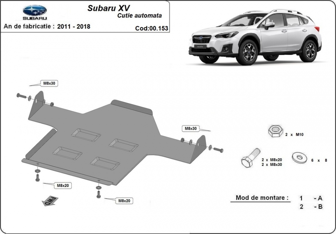 Skid plate for the protection of the: gearbox The skid plate is new and fits perfectly for all versions of Subaru XV manufactured between 2011 and 2018. Made out of 2 mm thick Steel plate. Screws, nuts, clips, all fastening accessories are included. All skid plates are powder coated to prevent corrosion. The exterior of the skid plate is provided with Steel reinforcements, which increases the resistance to impact. |