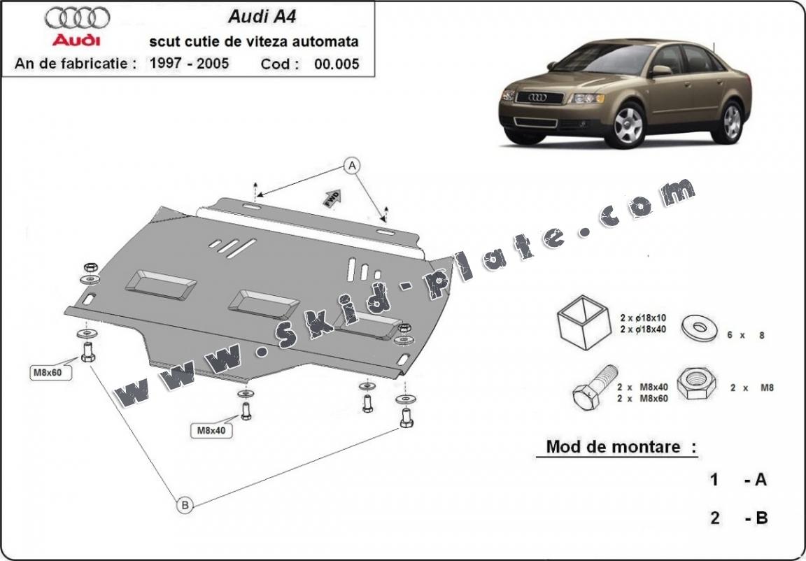 | The skid plate is new and fits perfectly for all versions of Audi A4 B6 - automatique manufactured between 2000 and 2008. |