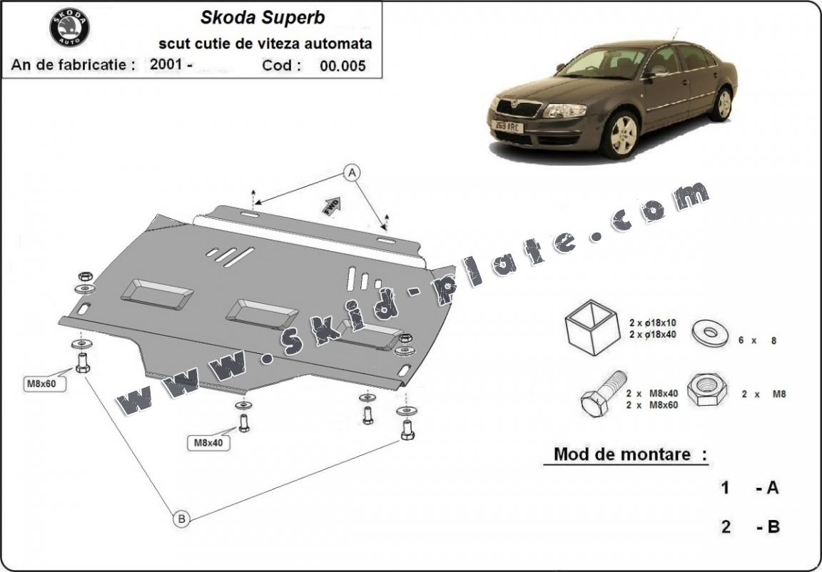 | The skid plate is new and fits perfectly for all versions of Skoda Superb - automatique manufactured between 2001 and 2008. |