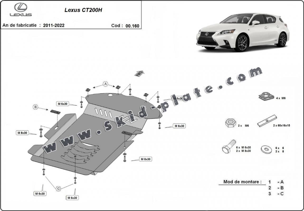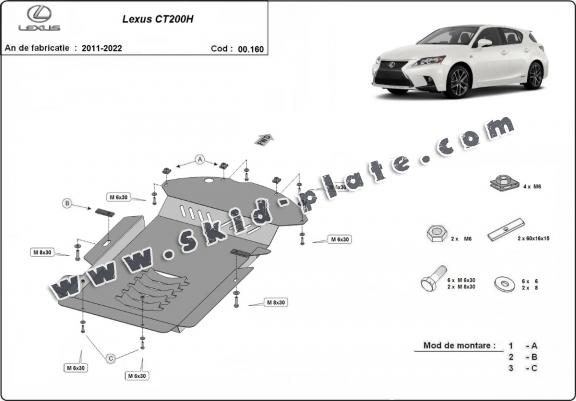Skid plate for the protection of the: Catalytic converter The skid plate is new and fits perfectly for all versions of Lexus CT200H manufactured between 2011 and 2022. Made out of 2 mm thick Steel plate. Screws, nuts, clips, all fastening accessories are included. All skid plates are powder coated to prevent corrosion. The exterior of the skid plate is provided with Steel reinforcements, which increases the resistance to impact. |